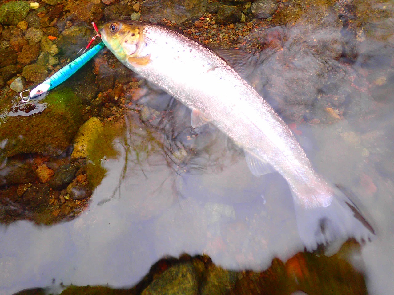 海サクラマス用のジグにヒットしたのは小型ブラウン。