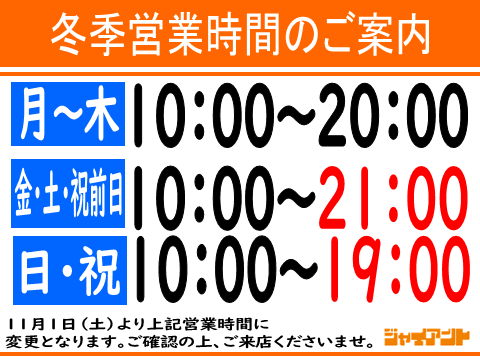 11月1日より当店は冬期営業時間とさせて頂きます。