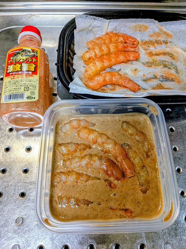 まずは一度海老の水分を抜いてしまおうかと考え、残っていたアミノソルト激旨で粉まみれ。
