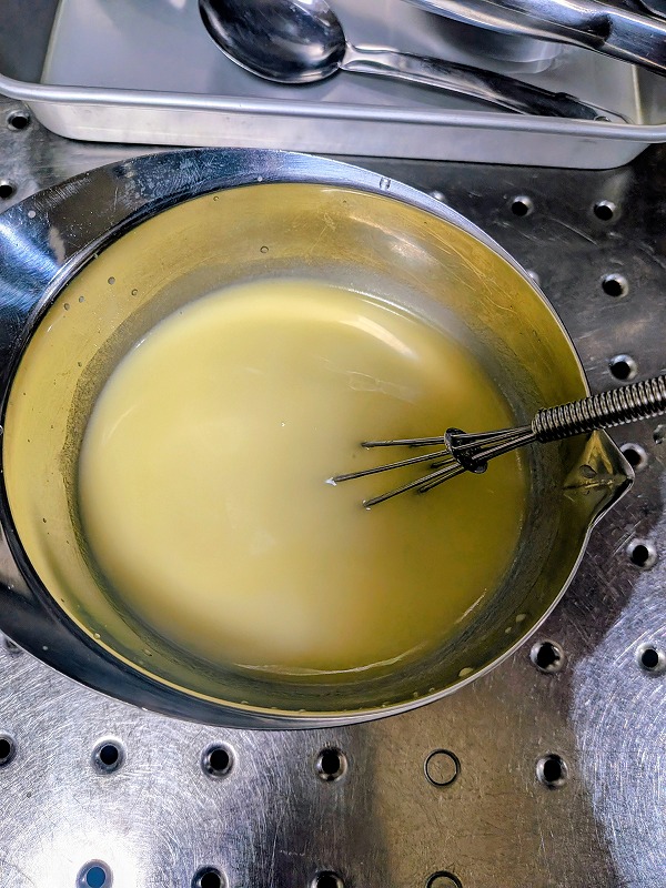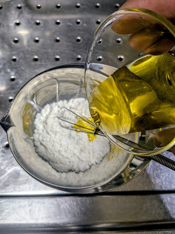 まずは小麦粉20gにオリーブ油90gをよーく混ぜまして・・油が多いので簡単に混ざるかと。