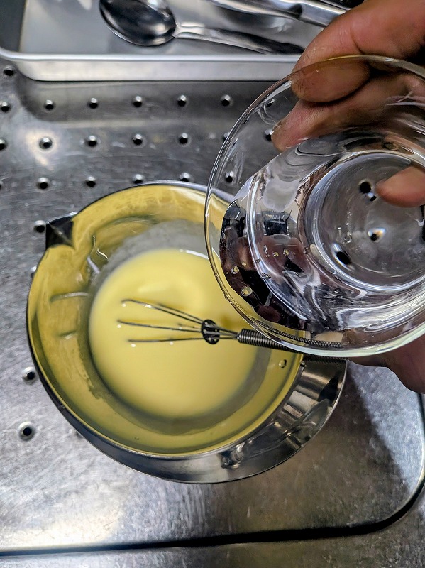 そしたらお水180g。少しづつ混ぜていきます。混ざったらお塩1g。以上!!